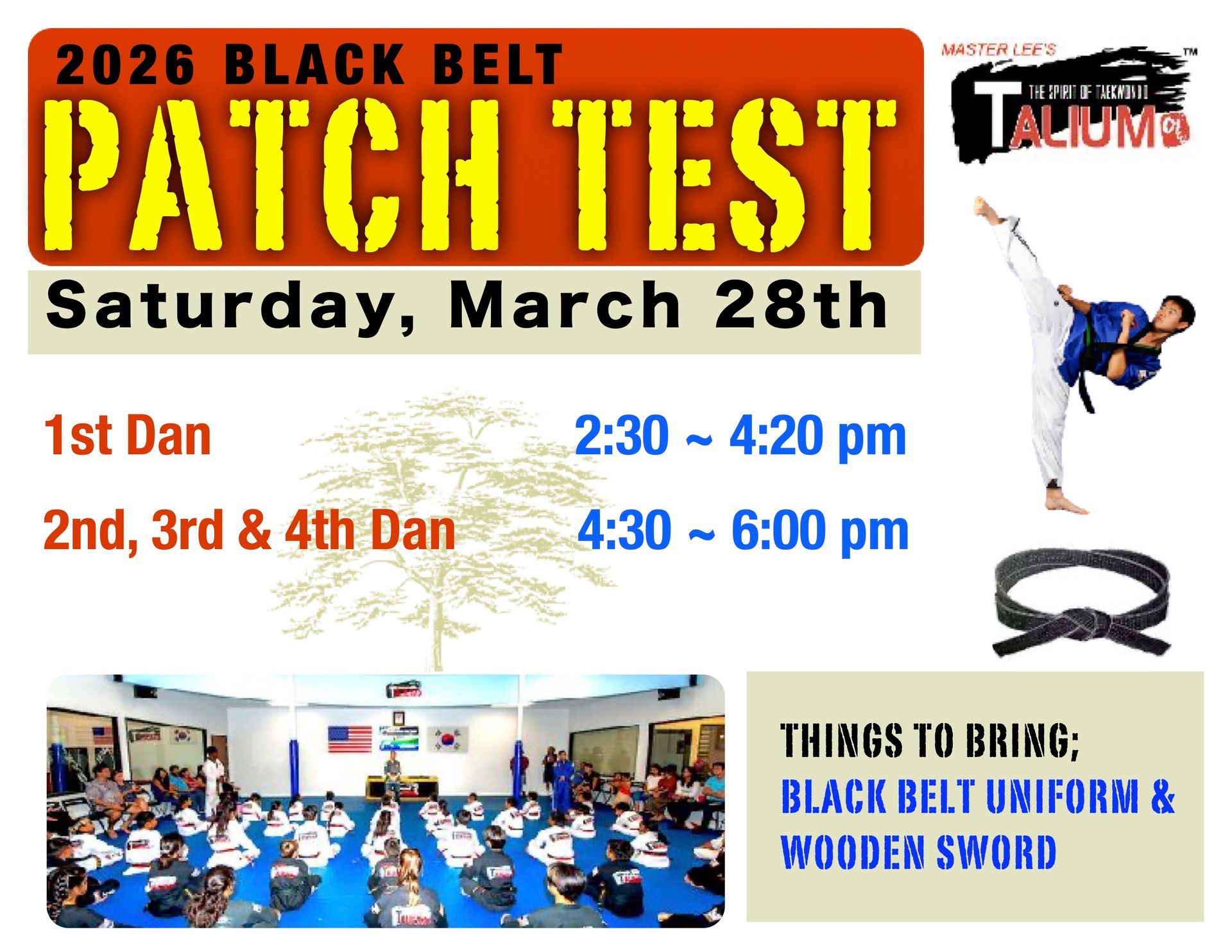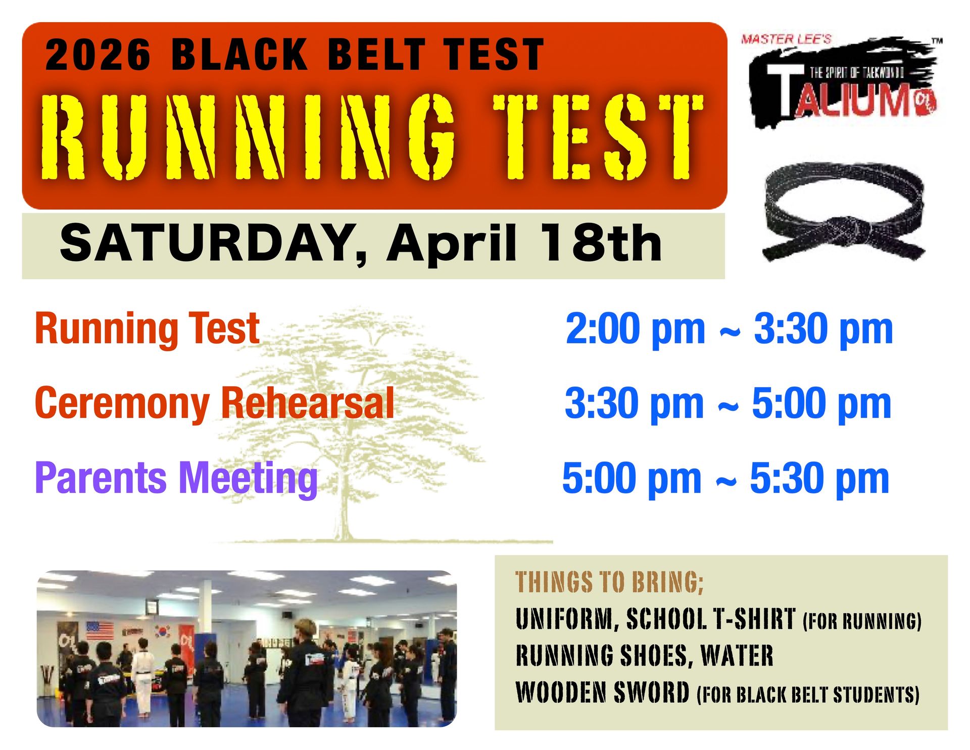 Black Belt Running Testing will be held on Saturday, November 1st at 2:00pm to 5:00pm. All Black Belt Students must bring a uniform, Running shoes and Talium T-shirts for your testing day. Must arrive at 1:45pm SHARP!!